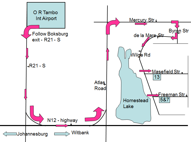 From the airport take the N12 highway to witbank. Take the Atlas road/Benoni offramp. Turn left into Atlas road, at the second set of robots turn right into Mercury street. Follow Mercury past the Robots and vet and turn right into Byron. At the stop turn right into De La Mare and continue along into Wilge Road next to the dam Turn left into Masefield Street and stop at number 13, the second house on the right.